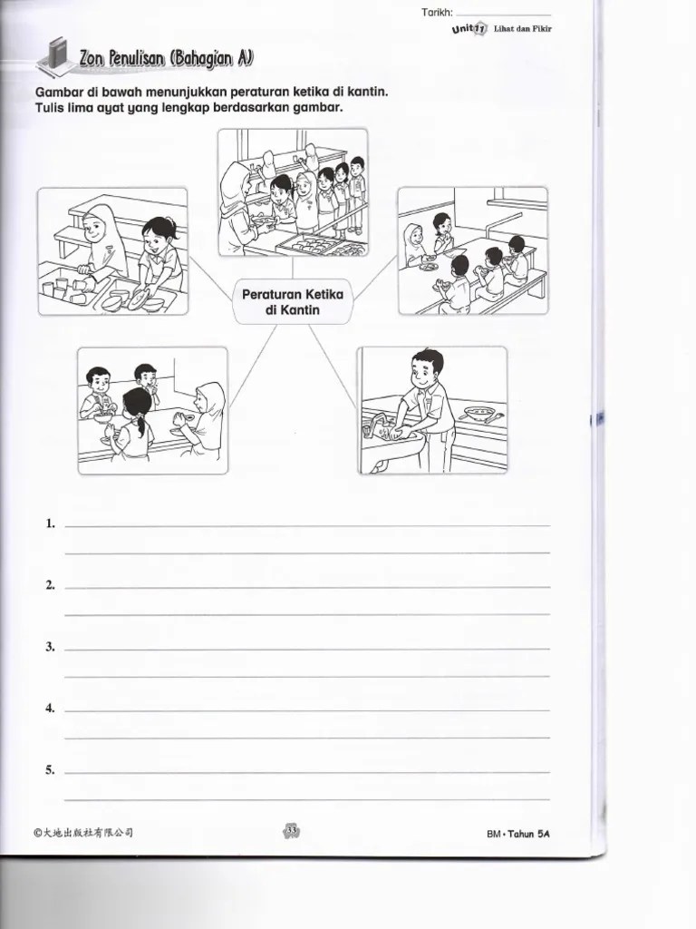 Tulis lima ayat yang lengkap tentang situasi/keadaan yang terdapat dalam gambar.